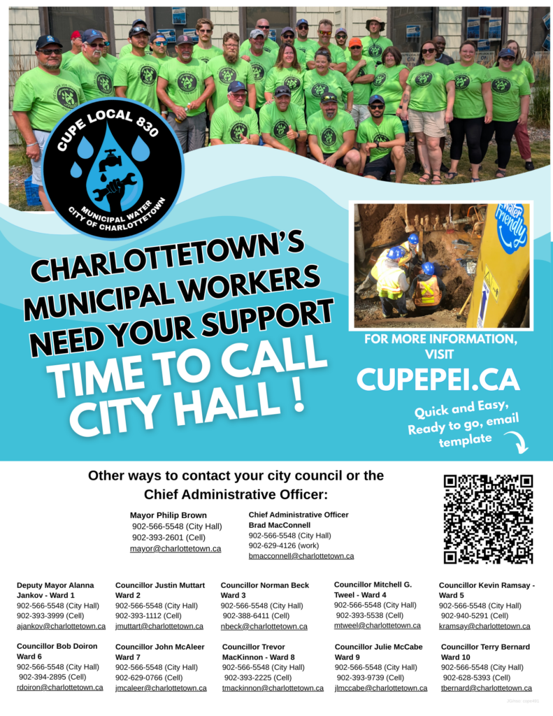 The best way to support Charlottetown’s municipal water and sewer workers is to contact City Hall. Let the Mayor, CAO, and your councillors know you stand with CUPE Local 830 and support a fair deal for the workers who keep our city running. Your voice matters, speak up for respect, safety, and good public services.